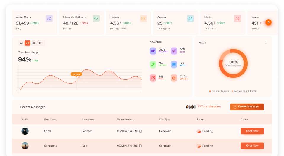 Manage WhatsApp, Instagram, Messenger, SMS, and Voice from one platform.